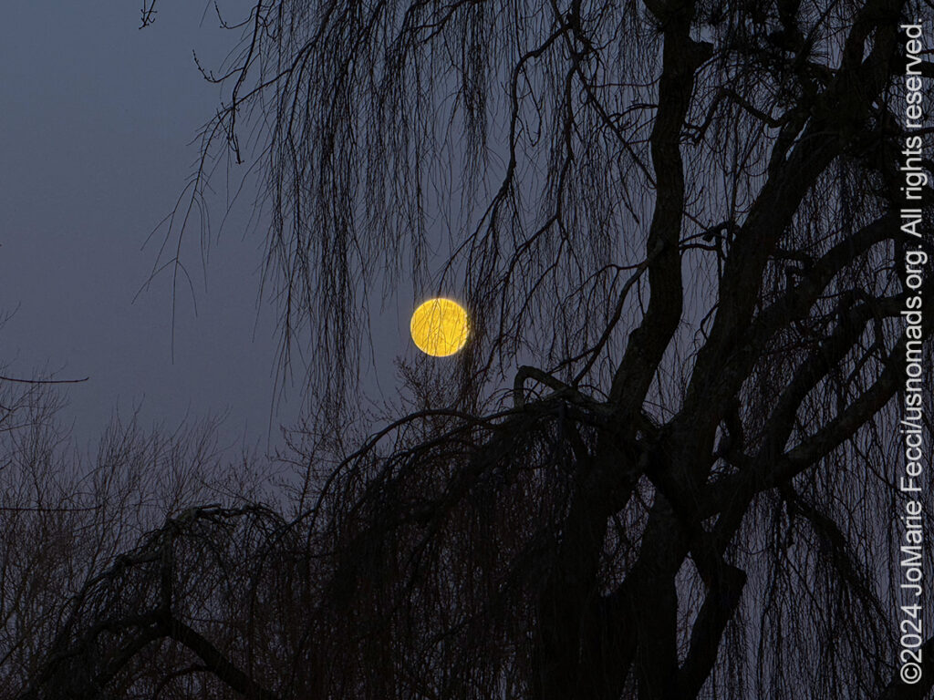 14 December 2024: Enjoyed an unseasonably warm night with a full moon rising behind the bare tree branches in the backyard. Made a nice fire in the firepit and stayed outside for a little bit. Noticed that the “backyard” bunnies were out late nibbling on the grass and maybe enjoying the evening’s gentle air just like we are…