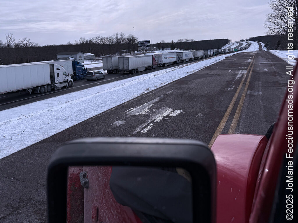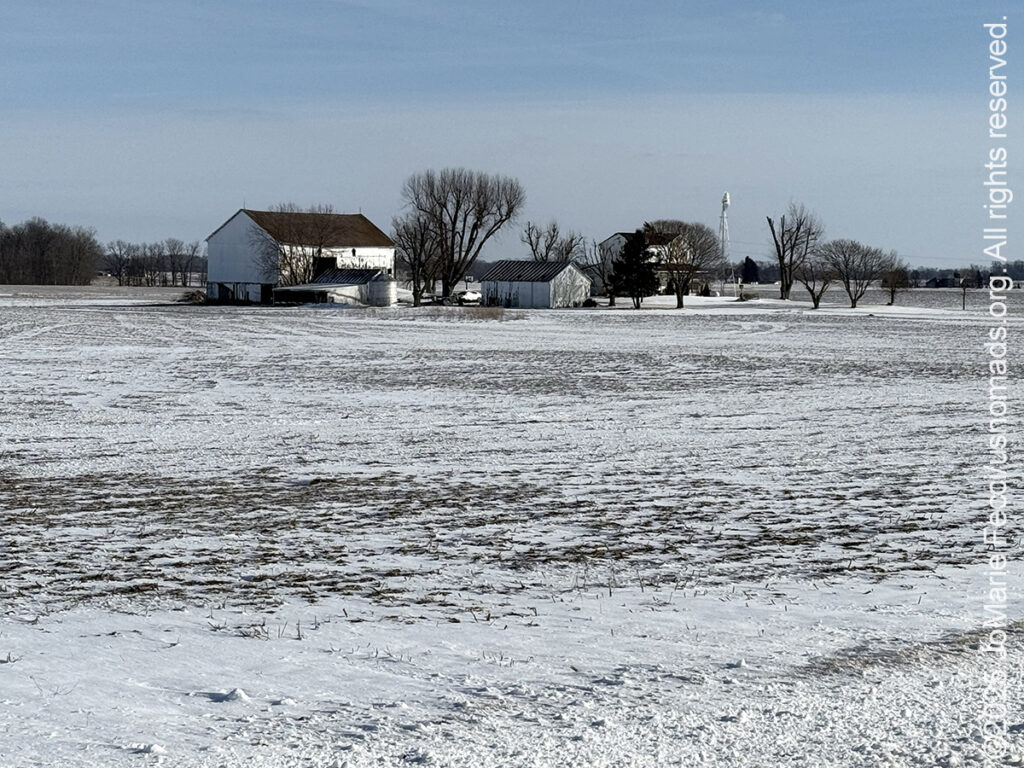 18 February 2025: Insanely cold temperatures continued today, as I continued forward covering West Virginia, Ohio, Indiana and into Illinois. I kept just pushing on ahead. There was snow everywhere and it was beautiful transforming the rural landscapes, but it was just way too cold to really “do” anything outside. Single digit temperatures with “feels like” posted at -12° Fahrenheit. I didn’t want to get out of the Jeep at all — not even to get gas — and that almost came back to bite me later on, as I had used the Jeep’s gas “range” display to determine I had enough gas to reach my next stopping point. The display said I had a range of 182 miles, and I only had to go 143 miles, so it seemed like I would be fine. However, the gusting headwinds apparently impacted my mileage a lot, and at one point I noted my gas gauge looked quite low. When I checked the range again it said I had 76 miles, but I still needed to drive 93 miles!!! Suddenly I would need to find gas between “here” and “there” but I was driving through a rural woodland area with long distances between exits and not all of the exits had “services”. I started getting concerned and pictured myself running out of gas on a frozen section of highway and having to bundle up in one of those silver foil space blankets so I didn’t freeze to death waiting for Triple A in the middle of nowhere — and praying I would have cell signal to call them! Luckily I found gas before that happened and made a note to self about the inaccuracy of the “range” display, vowing not to let this kind of thing happen again…