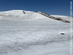19 February 2025: In the morning I decided to try to at least stop at a few key places en route, so I started off with the Cahokia Mounds World Heritage Site, an important Mississippian cultural site that protects some pretty impressive examples of the mound builders’ work. This morning they were covered with a blanket of snow that somehow made them seem even more otherworldly. From there I continued across the Mississippi, once the dividing line between “east” and “west” and stopped briefly at the Gateway Arch National Park to photograph the “archway” monument as I entered St. Louis, Missouri. Soon the snow started again. And the Interstate was shut down with a long line of tractor trailers at a standstill due to a serious accident somewhere further ahead. A sign said there was at least a 2-hour delay there, and luckily I remembered that historic Route 66 parallels the Interstate through much of Missouri, so I got off the highway and went looking for the old Mother Road. I found it, and it was still covered with a layer of snow, but thanks to Rubi the Jeep that was not a problem. We drove on through the beauty of fresh snow in the countryside, alone on the unplowed road, taking our time, until somewhere further on, our path intersected with the Interstate again. This section was open and we got back on it, still moving slowly due to road conditions, crawling with the traffic all across the state of Missouri. At Springfield the weather seemed to break a little bit, and it was also time to make a stop at the giant Buc-cee’s there for gas and more snacks than we probably needed. Smiling at all the beaver things, and with a full tank of gas, we left as the sunset and continued into Oklahoma before stopping for the night…