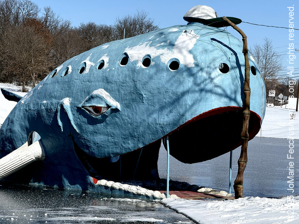 20 February 2025: The storms seem to have subsided and the sun was shining this morning, though it was still very cold in eastern Oklahoma when I started the drive day. A coat of snow covered everything, even the Blue Whale at Catoosa who sat in his frozen pond not seeming to really mind at all. But as I drove west it seemed to dissipate, and by the time I reached Oklahoma City I didn’t notice snow at all. Stopped for a great steak dinner at McClintocks Saloon near the Stockyards before calling it a night …