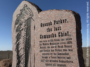Quanah Parker, the last Comanche Chief, was born in Elk Creek just below the Wichita mountains circa 1850. Quanah, the son of Petah Nocony and Cynthia Ann Parker who was captured by the Comanches, became a fierce warrior and skillfully defended Comancheria against all invaders. Col. Ranald McKenzie pursued Quanah for years but never captured or defeated him. The destruction of the buffalo forced Quanah to lead the Comanche down this trail to Fort Sill in June 1875. A born leader, Quanah bridged the great gap between the old world as a War Chief to the new life as a Civil Chief without losing his Comanche identity…