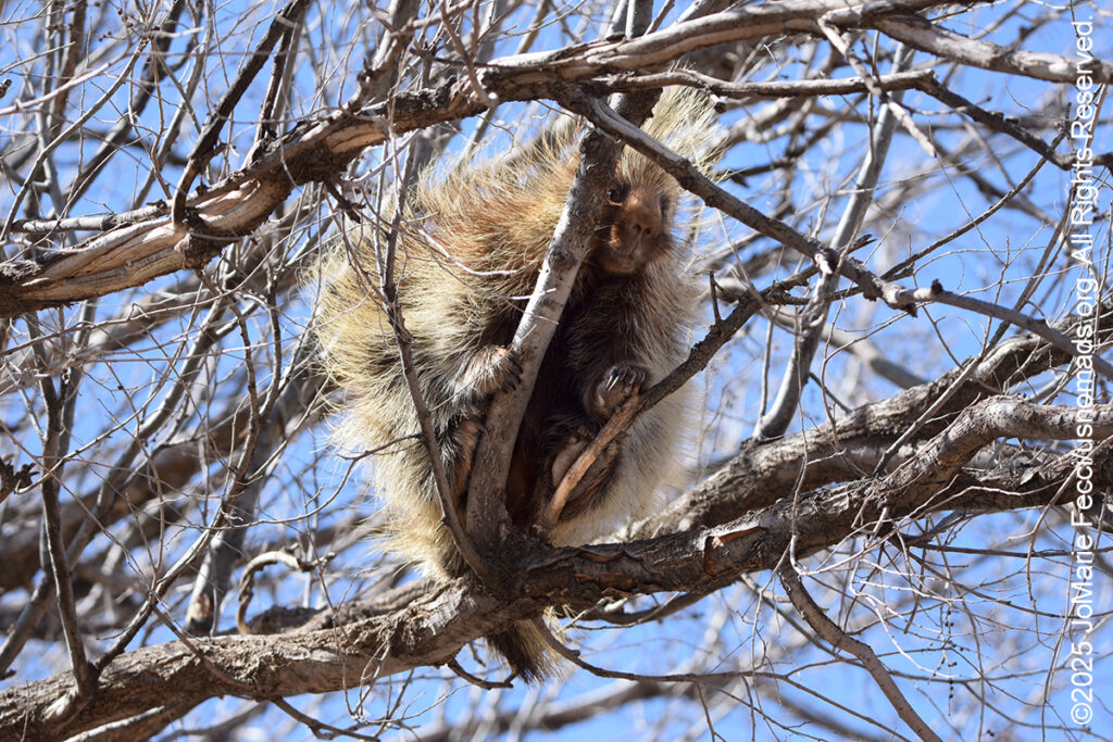 22 February 2025: The weather was finally nice, and we started out in the morning with a quick pilgrimage to the Cadillac Ranch art installation, which remains as popular as ever, though there have been subtle changes to the relationship of the public to the works of art and how the whole site is managed. The old cadillacs themselves seem to be “fortified” with all the layers of paint, that almost forms it’s own textured “skin” covering the steel skeletons of the vehicles. From Amarillo we headed to Buffalo Lake National Wildlife Refuge, where we spent some time exploring by vehicle and on foot. The refuge was quiet compared to the Witchita Mountains one. It was closer to midday and there were few animals out and about, however I did see some whitetail deer in the wooded areas. They leaped off as soon as I attempted to photograph them, but I got a few quick shots from a distance. The coolest “sighting” happened when I was on a short hike and looking up thought I saw a big nest in one of the trees — as “nest” is one of the items on our photoquest list for the Nomad Rally, I decided to grab a picture of it, but as I got closer and tried to frame it, I realized it was an animal! I had never seen an animal that looked like that before, but I had recently seen a post online that showed a porcupine and this resembled that image. I got out the big camera and made several photos of it. It was as curious about me as I was about it, and it watched me carefully from its perch in the tree until I finished and left the area. I was really happy with my “discovery” and later confirmed that it was indeed a porcupine. From there we continued on to another area of the refugee where there was supposed to be a prairie dog town, but the land was scarred with signs of a recent fire and there was no wildlife there at all. I felt bad for the little prairie dogs who had lost their homes, but I hoped that they had survived to start a new town somewhere else. We had spent more time at the refuge than planned, and the day was slipping away, so it was time to get back on the road and into New Mexico. We made it as far as Roswell, where we stopped for the night and I booked myself into the Roswell Inn, an alien-themed motel that seemed appropriate for the location…