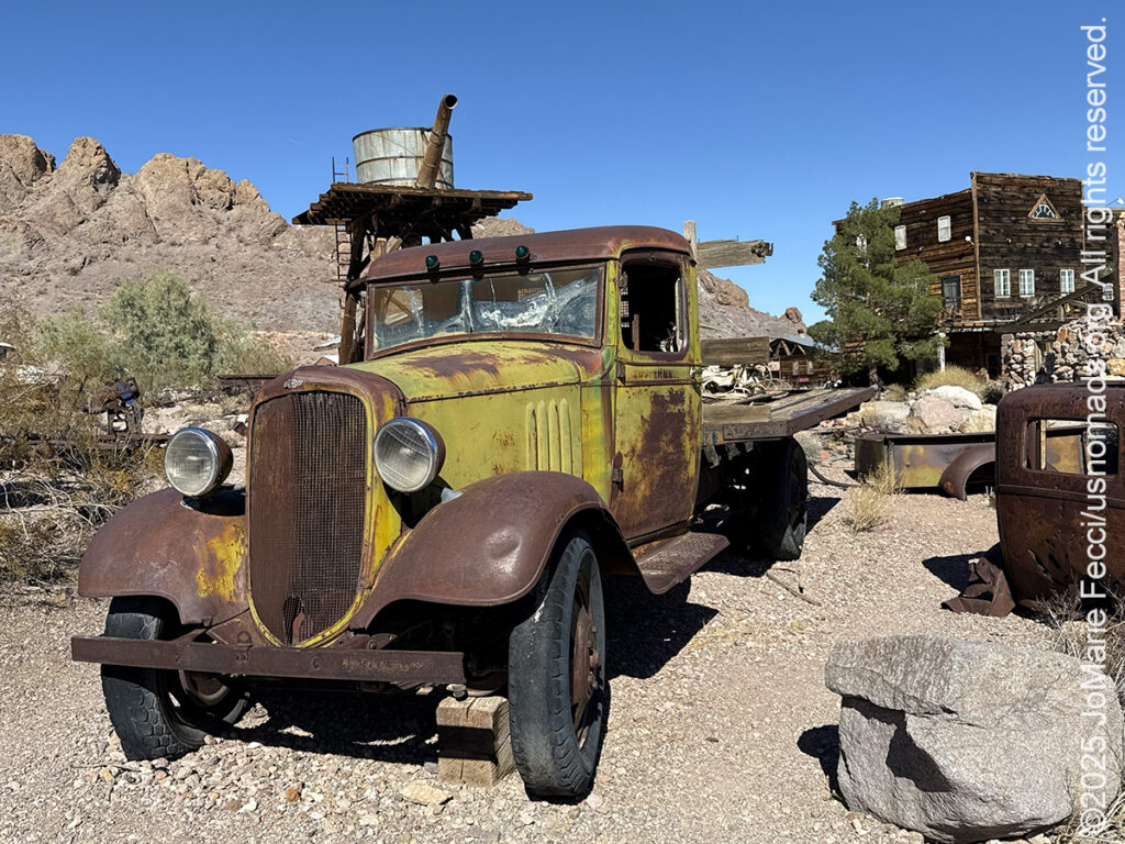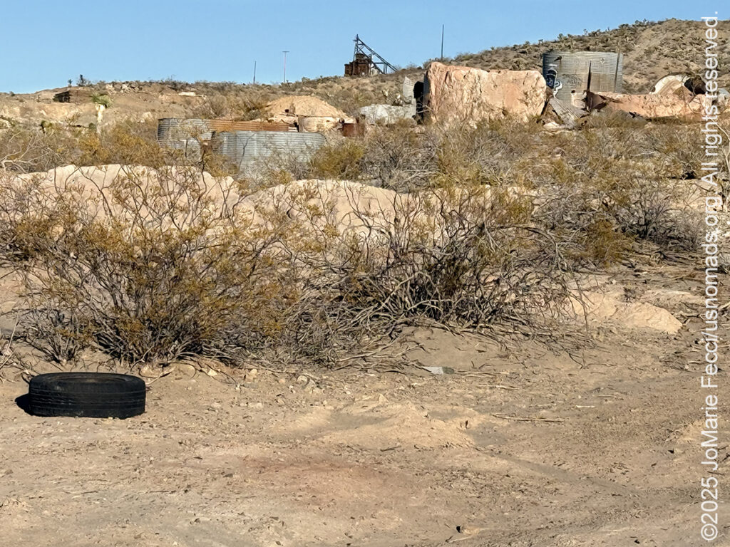 5 March 2025: There’s that one stretch of Highway that is a known “speed trap” where we have to slow to 25mph from 70mph around the town of Searchlight Nevada, and today I decided to take a little detour “into” the town. I was pulled in by some mine artifacts that I had seen and photographed from the main road before, but this time I wanted to try to get closer. I randomly chose a road that seemed to go behind the hill with the remains of the mine on top, and I found some dirt roads that went further into the area where there were ruins. Eventually I came to a fence and no trespassing sign, but before that I had some interesting discoveries poking around the crumbled buildings and debris of another historical boom-and-bust story…