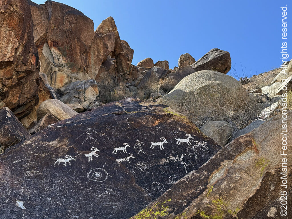 6 March 2025: Drove out to Grapevine Canyon, one of my favorite places to go for a little hike near Laughlin. The site is a short walk down a sandy wash that takes us through a sort of “portal” that consists of two “walls” of rocks on either side of the opening, and they are all etched with petroglyphs rising form the canyon floor to the sky. There are many many symbols carved into the stone, and no one really knows their meaning, but they are the timeless communications from the people who passed through here and found this place to be an important one. It is possible to climb up among the rocks and deeper into the back of the canyon, though this time I stayed towards the portal, content to climb up to my favorite petroglyph here, a line of sheep carved etched into a rock about halfway up the side of the canyon. It is possible to reach it by carefully climbing between rocks and loose gravel, and I always feel like “up” is easier than “down” (but that is probably the motivational factor of getting closer to the art). I spent some time just being here and in a sort of non-focused meditation observing the desert beyond and coming back to the individual etchings on the rock walls, and felt re-energized when I left …