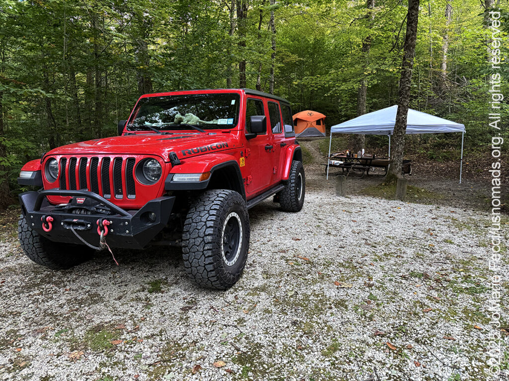 I made a note to myself to come back here closer to sunset in hopes of seeing the beavers, and then continued the rest of the way to the Chittenden Brook Campground. This National Forest campground is a small 17-site location without amenities and the long dirt access road cannot accommodate trailers over 18 feet, making it very welcoming for tent campers. The sites are nicely separated and quite large. I set up my “base camp” in three “sections” with the big Gazelle tent on top of a small hill where there was a nice level “tent pad”, then the easy-up covering a part of the picnic table by the fire pit, and finally the Jeep itself at the front of the site. As I began to get the fire started I felt that it was a really comfortable space and a great “hub” for exploring different areas of the forest.