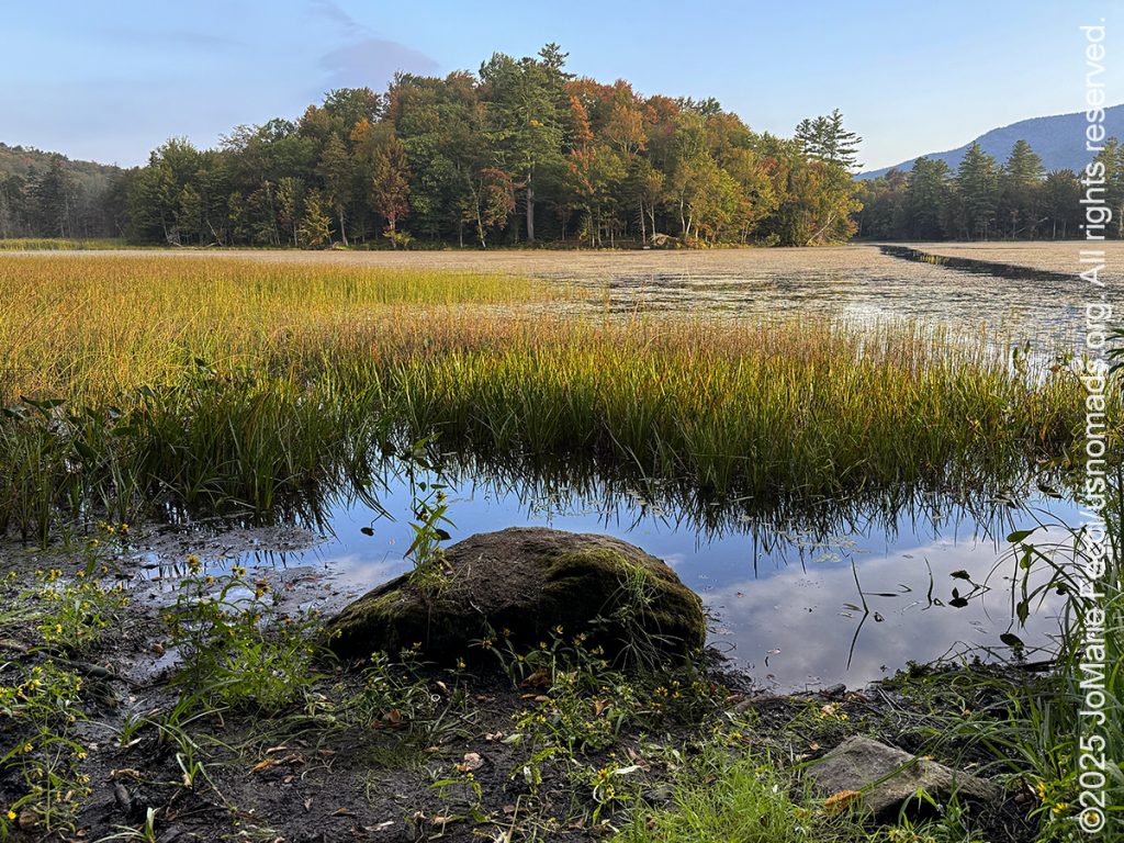 The Reservoir and the Pond are connected and at a certain point the road splits with one side going to the Reservoir and the other to the Pond. I took the Pond side first in hopes of finding some beaver activity, or at least some signs of beavers, even though it was probably already too late to catch them out of their lodge. I drove along the side of the pond, past the parking area, following Wildcat Road until it separated from the pond’s edge. The whole area was heavily forested and I turned back taking a slow crawl through the section where the marshy edges of the pond meet the road with lots of little water channels that looked like the kind of place beavers might be. I didn’t see any but I did find a nice little “drive-in” spot that took me through the trees and right to the edge of the main pond, which looked more like a lake than a pond to me. It was a vast open water with what looked to be a few islands and some places that were thick with marsh grass. I could see some ducks in the distance and a band of fog clinging to the tops of far off mountains. It was a beautiful scene and I just stayed there awhile observing and appreciating the moment.