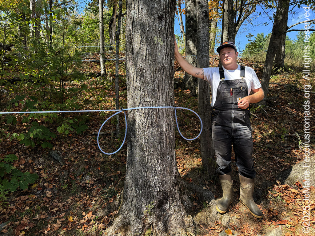 As I was finishing my lunch, Jenna suggested I take a stab at guessing the pumpkin’s weight, and while I had absolutely no clue as to how much a giant pumpkin could weigh, I made a guess anyway. I tried to reason it out by comparing the pumpkin’s size to a person, which I would later learn was a mistake, because apparently pumpkins are much denser than humans, lol! Nevermind, it was fun to be part of the game. When I told them how low I had guessed, the woman who had won the contest before, said she guessed a little low this year, too. We won’t find out the exact weight until after it is harvested and brought to the weigh-off. But giant pumpkins were not the reason for my visit–I was here to learn about the Baird’s maple syrup production. I joined Jacob for a walk around the property as he explained a little about how they make syrup from tree sap today.