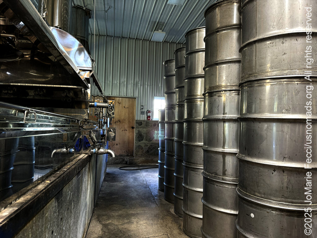 I arrived at the farm in time for lunch and sat at the picnic table next to Jenna’s flower garden taking in the ambiance as I ate. At the center of the farm are the iconic red barn, farmhouse and silo. The “sugarhouse” is to the side along with a small retail shop in the front. There are some beautiful flower gardens, a wildflower field and a pumpkin patch where Jenna grows giant pumpkins. Each year around Halloween she has a “guess the weight” contest for her largest pumpkin which gets harvested and taken to an annual “giant pumpkin weigh-off.” Competition pumpkins often tip the scales at over 1,000 pounds. While I was there a few local residents came by to visit with Jenna and make a guess at the weight of the pumpkin. One of the women tendering a guess today had won the contest in a previous year, correctly guessing the exact weight! It was interesting to see how neighbors in this rural community support one another. Jenna and Jacob are engaged with the community around their farm and even let a neighbor graze his cows on their land. Cooperation among neighbors seems to be more common here — some of the maple trees Bairds taps are on land that isn’t owned by the farm directly, and they make arrangements with the landowners to compensate them with money and syrup in exchange for the right to gather their sap.