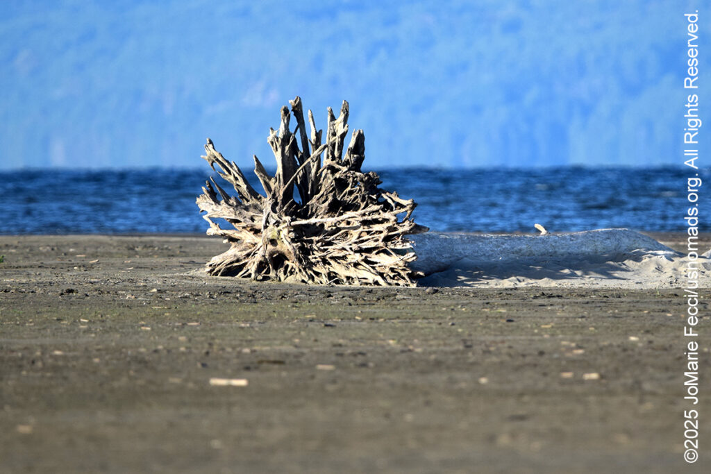 I found the small parking area for the Delta Park not far from the boat ramp. There was a hiking trail through the woods, and while I was unsure where it led, I decided to give it a try. It turned out to be a very short path that led out to reveal a wide open “beach” of sorts. It looked like a “tidal basin” to me, but I don’t think lakes have tides — it was a flat empty sandy stretch with puddles of water and debris that included many downed trees, their roots in various stages of becoming “driftwood” and the whole scene was transformed by a diffused morning light as the sun came up behind the cover of low clouds. It was absolutely beautiful in its own way and I momentarily forgot all about the beavers as I let myself be enchanted by the magic of the moment. I wandered the “beach” delighting in discoveries of driftwood and footprints and the randomness of nature’s “art”. I started walking towards the water’s edge and following it back in the direction of the river.